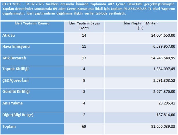 Çevre, Şehircilik ve İklim Değişikliği Bakanlığı Manisa İl Müdürlüğü, 2025 yılının ilk 7 ayında 487 çevre denetimi gerçekleştirirken, 69 adet Çevre Kanunu ihlali için toplam 91 milyon 656 bin 39 TL idari para cezası uyguladı.