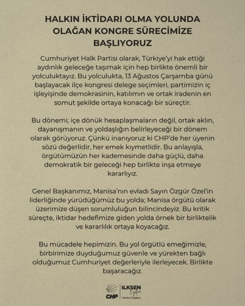 CHP’de olağan kongre süreci 13 Ağustos 2025 Çarşamba günü ilçe kongresi delege seçimleriyle başlayacak. CHP Manisa İl Başkanı İlksen Özalper kongre süreciyle ilgili açıklamalarda bulundu. Özalper, “Cumhuriyet Halk Partisi olarak, örgütsel bir yenilenmenin ötesinde, halkın iktidarını kurma yolunda önemli bir eşiğe daha gelmiş bulunuyoruz. 13 Ağustos 2025 Çarşamba günü başlayacak ilçe kongresi delege seçimleriyle, iktidar hedefimize omuz omuza yürüyeceğimiz kongreler sürecimizi başlatıyoruz. Bu süreci yalnızca bir takvim değil, halktan yana siyasetin yeniden örgütlendiği; umutların, inancın ve dayanışmanın büyüdüğü bir iktidar kongresi olarak görüyoruz. Katılımcı, şeffaf ve örgüt iradesine saygılı bir anlayışla yürüteceğimiz bu yolculuğun; örgütümüze, partimize ve ülkemizin demokrasi mücadelesine güç katmasını diliyorum. Birliğimizden doğacak cesaretle, umudumuzu büyüterek, iktidar yürüyüşümüzü hep birlikte omuzlayacağız” dedi.