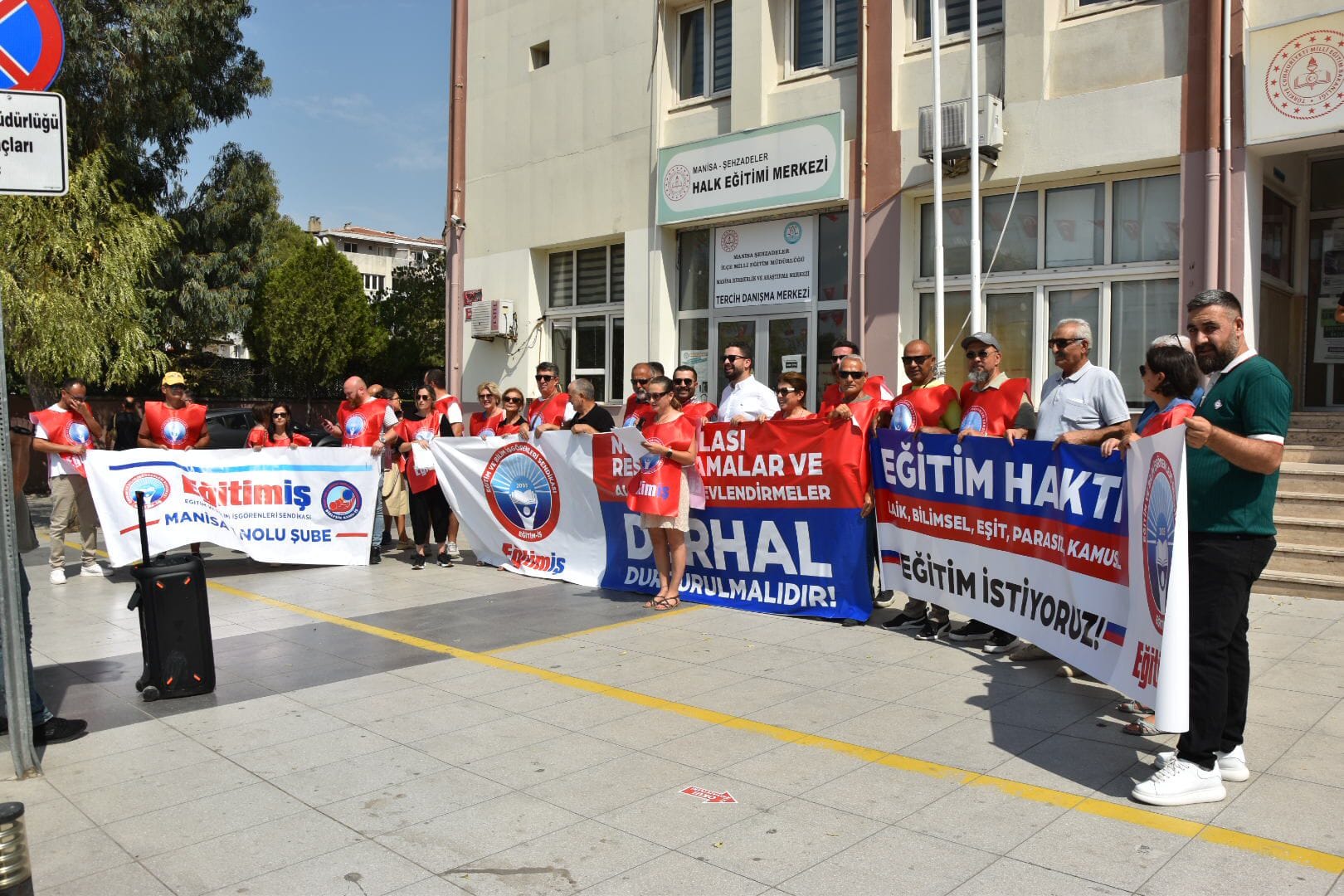 Eğitim-İş Manisa Şubesi, Milli Eğitim Bakanlığı’nın öğretmenlere yönelik hukuksuz uygulamalarını protesto etmek amacıyla Şehzadeler İlçe Milli Eğitim Müdürlüğü önünde basın açıklaması gerçekleştirdi. Açıklamaya, CHP Şehzadeler İlçe Başkanı Mert Özkösemen, 29 Ekim Cumhuriyet Kadınları Derneği Başkanı Fatma Ayhan, Eğitim-İş Manisa Şube Başkanı Lale Kale ve çok sayıda sendika üyesi katıldı.