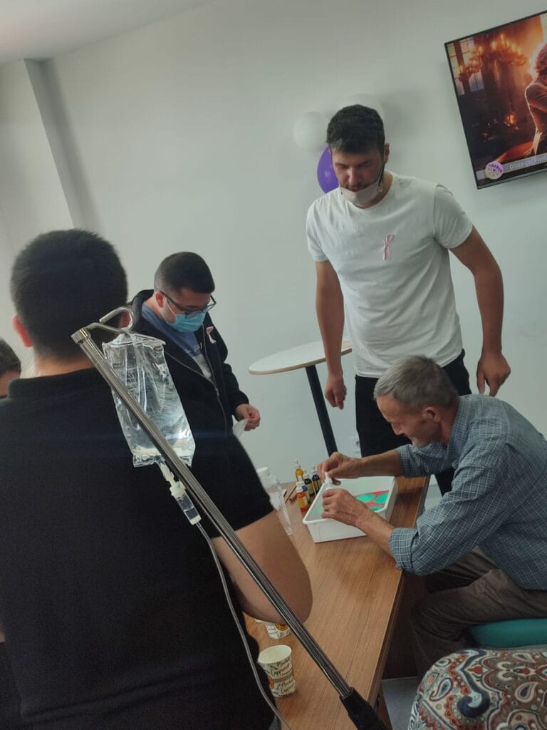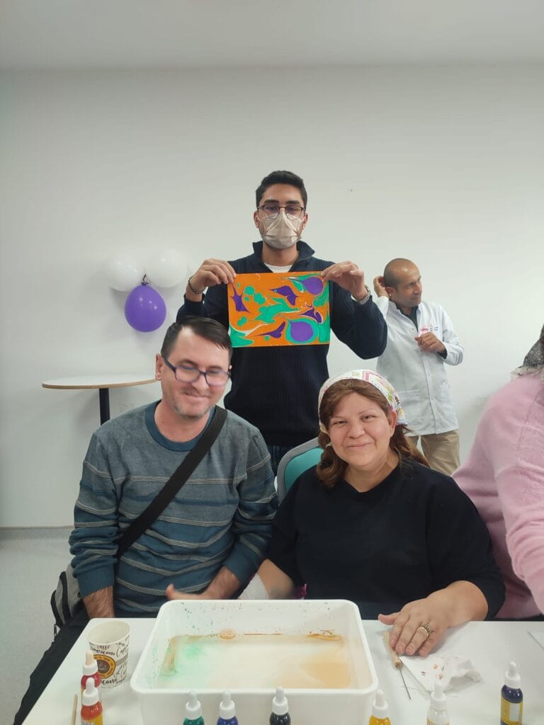 Hafsa Sultan Hastanesi Onkoloji Ek Hizmet Binası 2. Kat Çok Amaçlı Salon’da gerçekleştirilen ebru etkinliği, sanatın terapi edici yönünü bir kez daha gözler önüne serdi. Öğrencilerin rehberliğinde suyun üzerinde renklerin dansıyla ortaya çıkan eserler, hastaların zorlu süreçlerinde bir nebze olsun huzur bulmalarına yardımcı oldu.