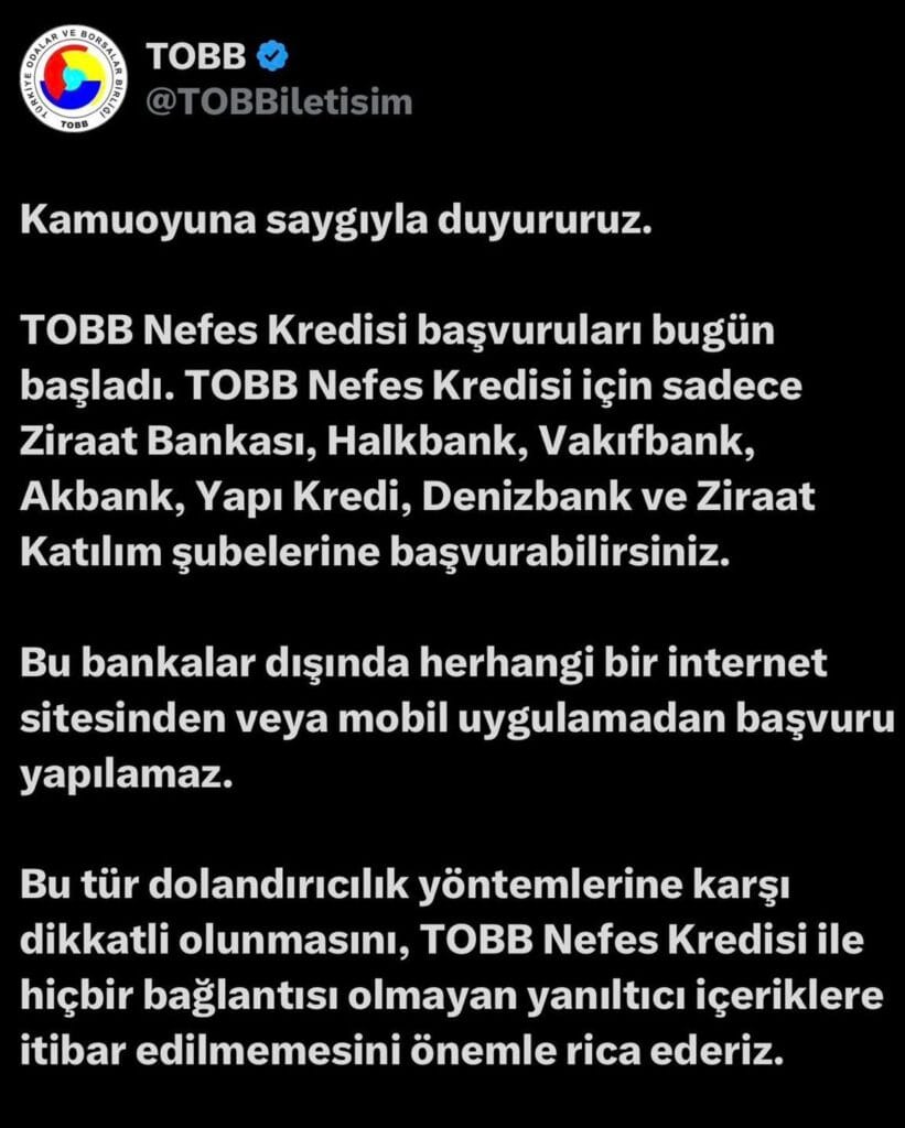 Manisa Ticaret ve Sanayi Odası’ndan yapılan açıklamada şu ifadelere yer verildi: “Kamuoyuna saygıyla duyururuz. TOBB Nefes Kredisi başvuruları bugün başladı. TOBB Nefes Kredisi için sadece Ziraat Bankası, Halkbank, Vakıfbank, Akbank, Yapı Kredi, Denizbank ve Ziraat Katılım şubelerine başvurabilirsiniz. Bu bankalar dışında herhangi bir internet sitesinden veya mobil uygulamadan başvuru yapılamaz. Bu tür dolandırıcılık yöntemlerine karşı dikkatli olunmasını, TOBB Nefes Kredisi ile hiçbir bağlantısı olmayan yanıltıcı içeriklere itibar edilmemesini önemle rica ederiz” dedi.